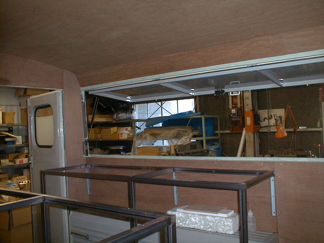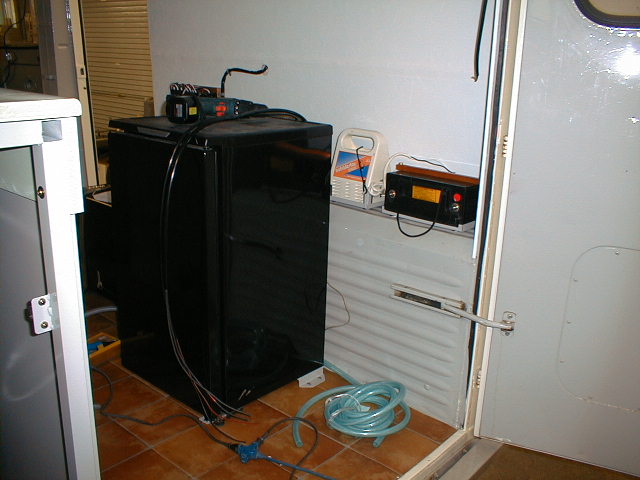 天板を除いた完成間際の室内、サイドドアからの様子。右テーブルより伸びているのは外部から取込む200Vと100Vの電源コード。給水タンク下にあるのは排水用ホース、サイドドア近くに室内照明用スイッチ