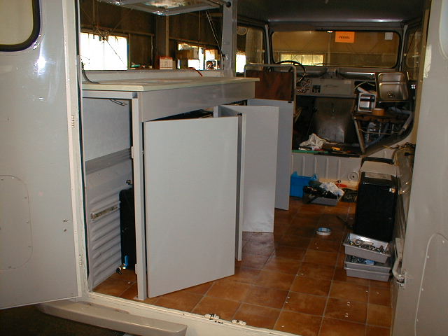 ドアや化粧パネルの塗装が終了、組立てと調整に入る。カーペットも貼られ、右側にコーヒーメーカー用の排水タンクが見える